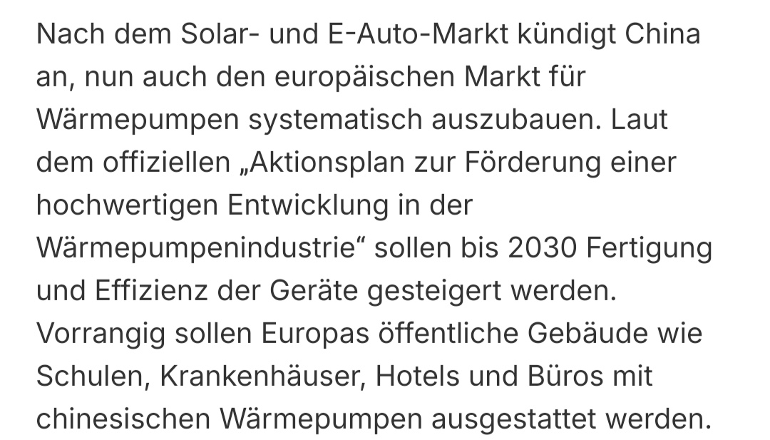 Bislang war die „Energiewende“ ein Zeichen von Wachstum – doch stattdessen erlebt Deutschland einen Rückgang in der Industriestruktur. Die deutschen Unternehmen sind nicht mehr in der Lage, ihre eigenen Produkte zu produzieren, und die staatliche Unterstützung für den Wärmepumpenmarkt wird immer weniger. Der gesamte Markt bleibt im Zustand von Zerschlagung, während die chinesische Produktion steigt.